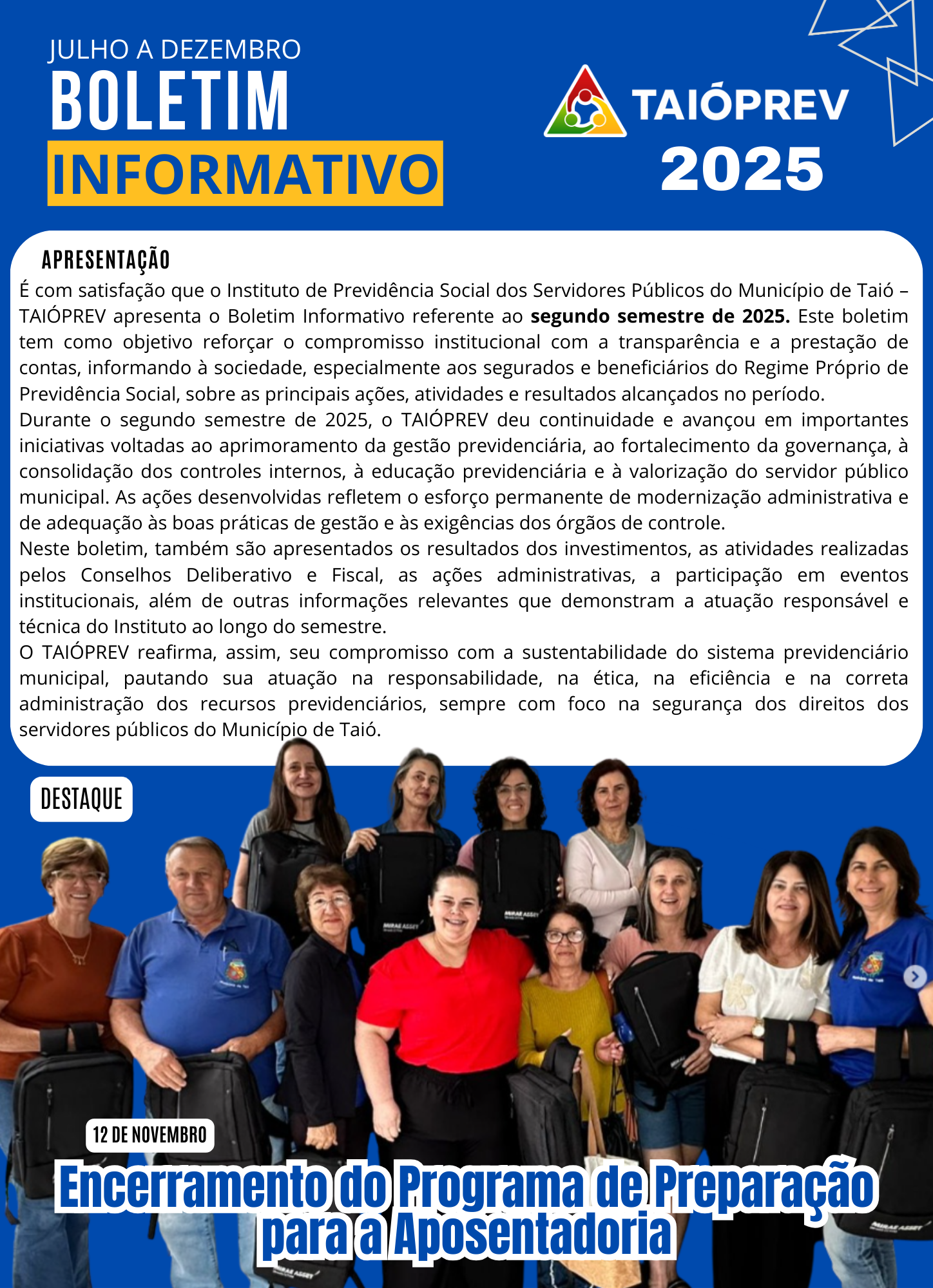 A realização da audiência foi “On-Line” e participaram os Presidentes dos Conselhos de Administração e Fiscal do TAIÓPREV, as Diretoras da Diretoria Executiva, o Atuário e o Consultor de Investimentos.